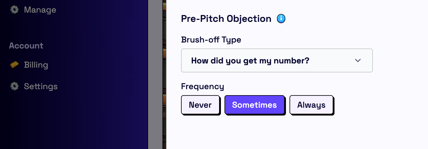 You can now select what type of objection the bot will present at the start of the call. For example, you can now select "I don't take cold calls" or "I'm going into a meeting", and select the likelihood of this coming up. You can see these new settings in the create or edit bot screens.